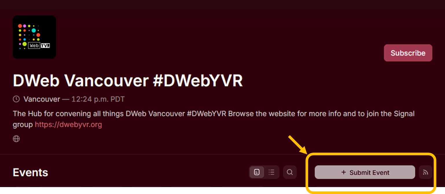 - Submit the lu.ma event to the DWebYVR calendar - by default, your event is created in your own account's calendar. If you do not have management access to the DWebYVR calendar, you can submit an event to the DWeb Vancouver calendar by following the instructions below.